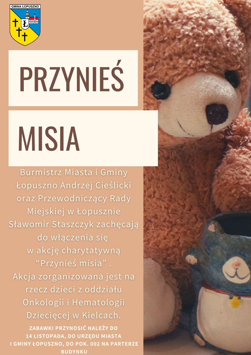 Drodzy Mieszkańcy! Burmistrz Miasta i Gminy Łopuszno Andrzej Cieślicki oraz Przewodniczący Rady Miejskiej Sławomir Staszczyk serdecznie zachęcają do włączenia się w akcję charytatywną „Przynieś misia”!