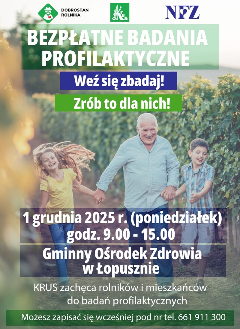 KRUS zachęca rolników i mieszkańców na bezpłatne badania profilaktyczne. 1 grudnia 2025 r. (poniedziałek) 9.00 - 15.00 Gminny Ośrodek Zdrowia w Łopusznie