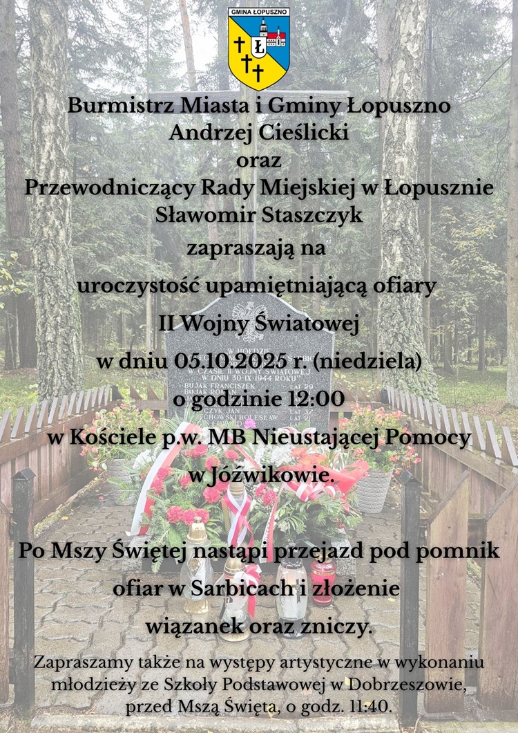 Burmistrz Miasta i Gminy Łopuszno Andrzej Cieślicki oraz Przewodniczący Rady Miejskiej w Łopusznie Sławomir Staszczyk zapraszają na uroczystość upamiętniającą ofiary II Wojny Światowej w dniu 05.10.2025 r. (niedziela) o godzinie 12:00 w Kościele p.w. MB Nieustającej Pomocy w Jóźwikowie.