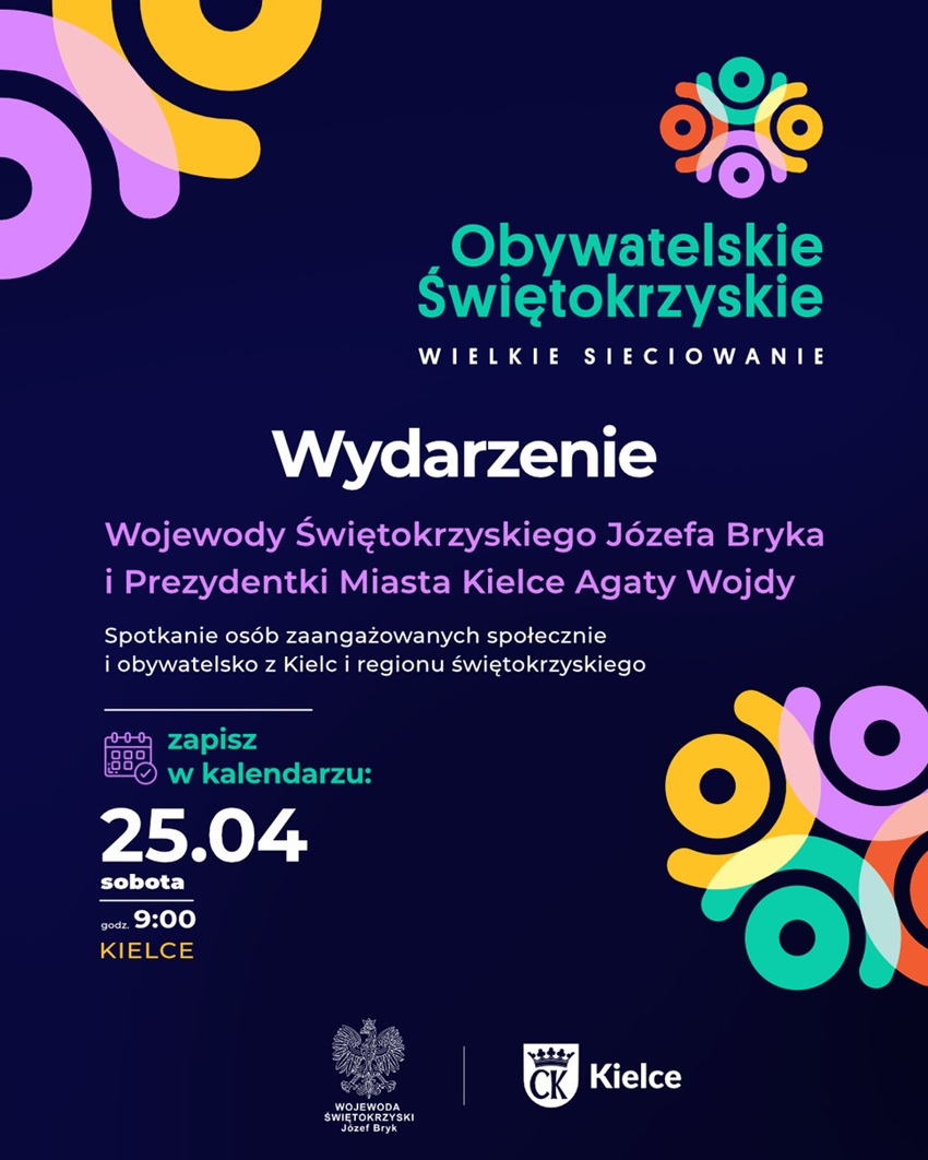 Wojewoda Świętokrzyski Józef Bryk oraz Prezydentka Miasta Kielce Agata Wojda zapraszają przedstawicieli organizacji pozarządowych oraz osoby zaangażowane społecznie i obywatelsko na wydarzenie pn. „Obywatelskie Świętokrzyskie. Wielkie sieciowanie”, które odbędzie się 25 kwietnia br. (sobota) w godzinach 9:00-16:00 w Centrum Kształcenia Zawodowego i Ustawicznego (CK Technik), ul. Łódzka 200 w Kielcach.