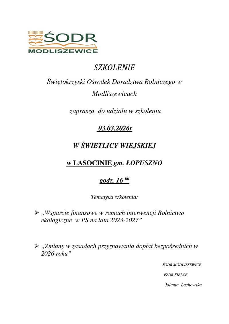 Świętokrzyski Ośrodek Doradztwa Rolniczego w Modliszewicach zaprasza do udziału w szkoleniu